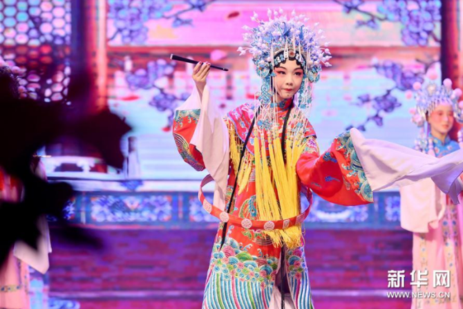 6月11日,在石家莊市青少年宮,裕華西路小學(xué)學(xué)生表演傳統(tǒng)戲曲選段《貴妃醉酒》。 新華社發(fā)張曉峰/攝