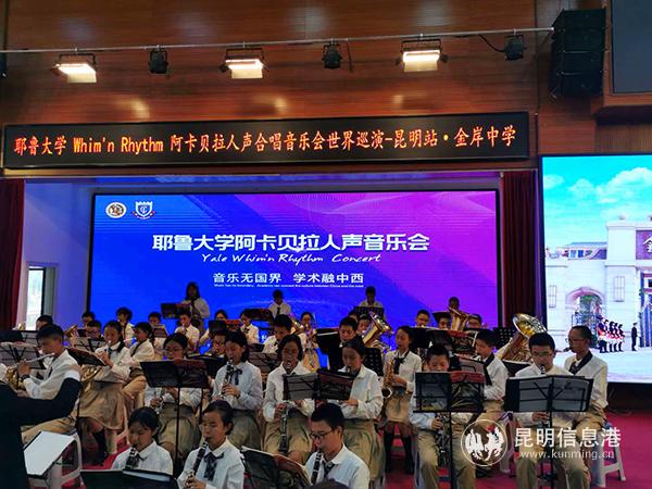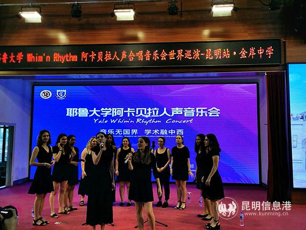 昆明信息港 記者馮冕蕓 6月10日晚,耶魯大學(xué)Whim'n Rhythm阿卡貝拉人聲合唱音樂會在昆一中度假區(qū)分校(金岸中學(xué))(以下簡稱“金岸中學(xué)”)舉行。這是該合唱團(tuán)第二次到訪金岸中學(xué)。