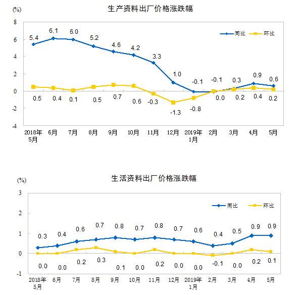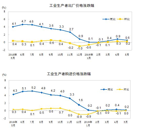 記者從國(guó)家統(tǒng)計(jì)局獲悉,2019年5月份,全國(guó)工業(yè)生產(chǎn)者出廠價(jià)格同比上漲0.6%,環(huán)比上漲0.2%;工業(yè)生產(chǎn)者購(gòu)進(jìn)價(jià)格同比上漲0.2%,環(huán)比持平。1—5月平均,工業(yè)生產(chǎn)者出廠價(jià)格比去年同期上漲0.4%,工業(yè)生產(chǎn)者購(gòu)進(jìn)價(jià)格上漲0.2%。