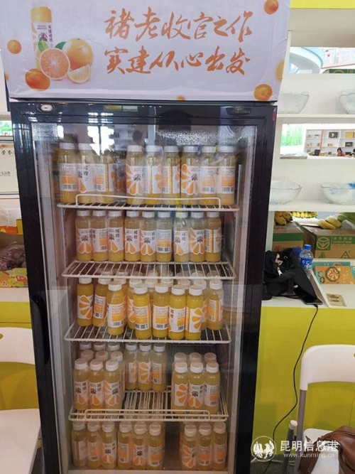 走進2號綠色食品館,目之所及全是云南各類綠色有機農(nóng)產(chǎn)品??吹美哿?走得渴了,不妨到實建公司展區(qū)喝上一瓶NFC鮮榨果汁,換種方式吃褚橙,記者買了一瓶,口感原汁原味。