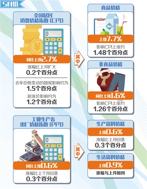 根據(jù)測算,在5月份2.7%的同比漲幅中,去年價格變動的翹尾影響約為1.5個百分點,新漲價影響約為1.2個百分點。