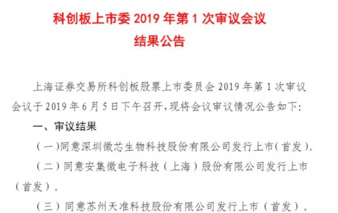 6月5日,科創(chuàng)板上市委召開第1次審議會議,審議深圳微芯生物科技股份有限公司、安集微電子科技(上海)股份有限公司、蘇州天準科技股份有限公司等3家企業(yè)發(fā)行上市申請。最終三家全部過會!