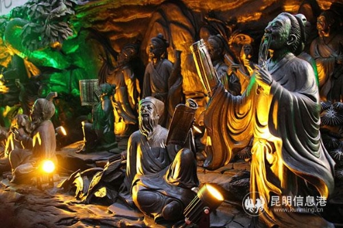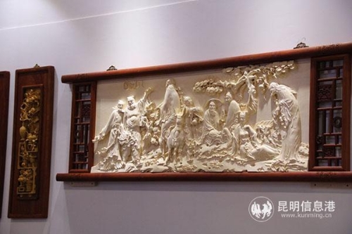 來(lái)自北京的吾家宮殿根雕藝術(shù)館展區(qū)內(nèi),一件長(zhǎng)3米、最高2.6米,寬1.3米,橫貫展區(qū)的根雕作品“孔門(mén)七十二賢”則重現(xiàn)了孔子授課的經(jīng)典場(chǎng)景。該作品以弘揚(yáng)“尊師重道”的中國(guó)傳統(tǒng)文化為主題,根雕重達(dá)8噸,由1位師傅帶著5名徒弟耗時(shí)3年時(shí)間才制作完成,特別之處在于整個(gè)作品僅用一根完整的烏木雕刻而成,在本次商洽會(huì)期間為首次亮相。