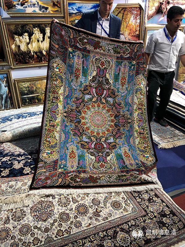 “你們猜猜這地毯邊上的絲綢來自哪里?”在9號南亞館的另一隅,伊朗的地毯商Mostafa手持一塊地毯,說著流利的中文與展區(qū)前的顧客互動了起來。他解釋稱:“就是用中國的絲,波斯地毯編織工藝中引入絲綢就是中國古代絲綢之路的碩果。”