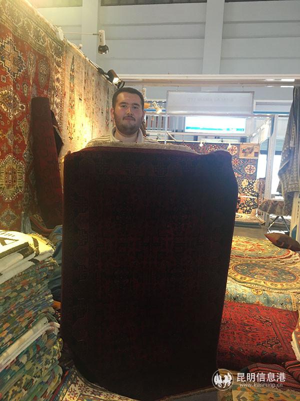 阿富汗參展商Basir Amani展示此次參展的佳品Biljik Khalmahmadi地毯。記者譚石艷 攝