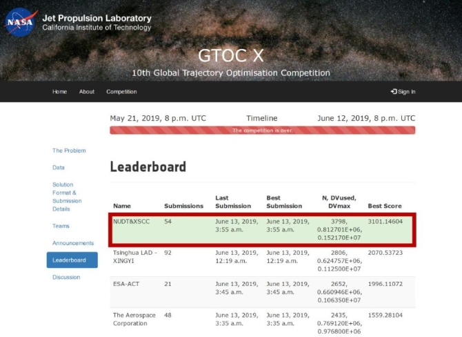 時間倒回到當天凌晨3:55分,距比賽結(jié)束僅有五分鐘,由國防科大空天科學(xué)學(xué)院羅亞中教授帶領(lǐng)的國防科技大學(xué)與西安衛(wèi)星測控中心聯(lián)隊(NUDT&XSCC)提交了最終結(jié)果——3101分,以絕對的優(yōu)勢摘得桂冠!
