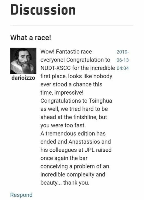?。▋?nèi)容翻譯如下:wow,精彩的比賽!向不可思議的第一名NUDT-XSCC隊伍致敬,這一次他們的優(yōu)異表現(xiàn)讓其他隊伍根本毫無機會,讓人印象深刻。同樣祝賀清華大學(xué),我們的隊伍在比賽末段非常盡力追趕,但你們實在是太快了。我們剛剛完成了非常精彩的一個<軟件>版本,Anastassios和他在JPL的同事再次在這個集復(fù)雜和美學(xué)于一體的問題上更上一層樓,謝謝你們。)