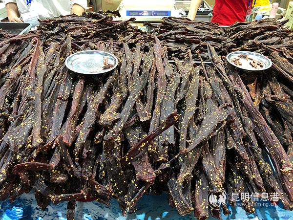 18號展館內(nèi),各類風(fēng)味手撕干巴應(yīng)有盡有,但小編還是“獨寵”德宏風(fēng)味手撕干巴。老板邊忙著招呼顧客,邊利落地錘著一塊干巴。他頗為自信地說道:“干巴錘過后吃起來更香”。