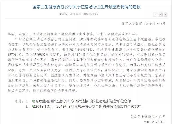 近日,國家衛(wèi)生健康委員通報了關(guān)于住宿場所衛(wèi)生專項的整治情況,通報指出:針對住宿類公共場所暴露出的衛(wèi)生問題,2019年初國家衛(wèi)生健康委員部署開展住宿場所衛(wèi)生專項整治。各地按照要求,以規(guī)范客房衛(wèi)生清掃和公共用品用具清洗消毒保潔為重點(diǎn),集中開展專項整治,強(qiáng)化落實公共場所經(jīng)營者衛(wèi)生安全主體責(zé)任。截至2019年3月31日,各地衛(wèi)生健康部門共報告監(jiān)督檢查住宿場所157011家,責(zé)令25868家單位整改,依法對3474家單位立案查處。