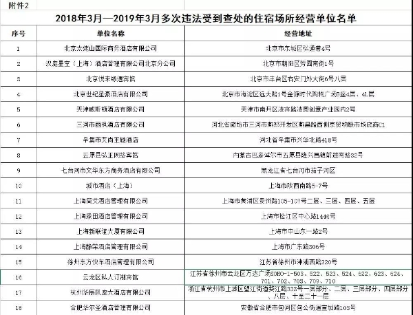 ②2018年3月—2019年3月多次違法受到查處的住宿場所經(jīng)營單位名單