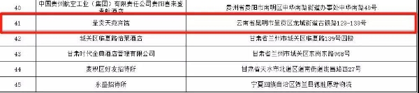 其中,涉及云南的住宿場所有兩家,分別是:呈貢天苑賓館(云南省昆明市呈貢區(qū)龍城街道古銀路129-139號),2018年3月—2019年3月多次違法受到查處;