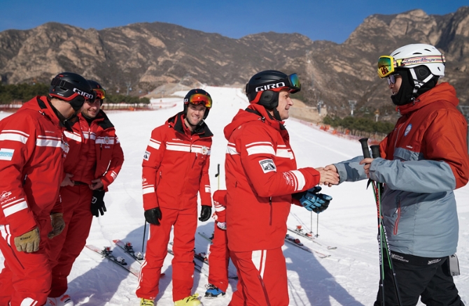 郎恩鴿是延慶海坨農(nóng)民滑雪隊隊長,2018年度北京榜樣。2017年7月11日,他帶領(lǐng)18名高水平業(yè)余滑雪愛好者成立了志愿服務(wù)性質(zhì)的海坨農(nóng)民滑雪隊,11名隊員順利通過培訓(xùn)考核,取得瑞士國家職業(yè)滑雪指導(dǎo)員證書,具備專業(yè)滑雪教練員資質(zhì)。圖為郎恩鴿向瑞士教練學習滑雪技術(shù)。 首都文明辦供圖