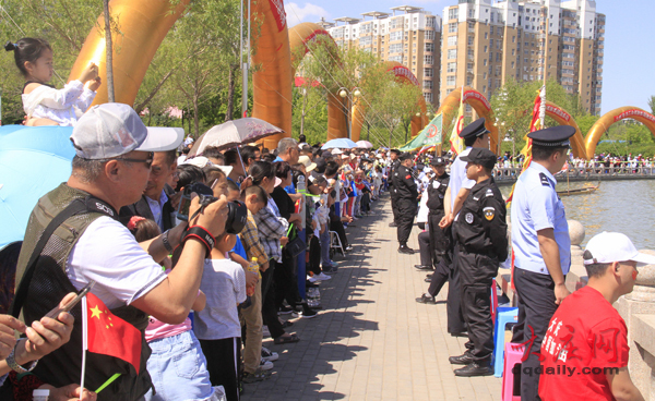 6月16日,黎明湖碼頭陽光明媚、旌旗飄揚。由大慶市政府主辦,市委宣傳部、市總工會、市文化廣電和旅游局、市體育局承辦的“龍騰百湖”2019年中國·大慶第八屆龍舟邀請賽在黎明湖上激情開槳?!扒Х备偠桑鞍亵础睜幜?,萬余市民到場觀戰(zhàn)。