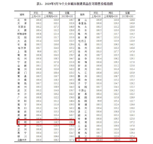 國家統(tǒng)計局18日發(fā)布5月份70個大中城市商品住宅銷售價格變動情況顯示。其中,昆明新建商品住宅價格環(huán)比漲0.7%,同比漲16.5%,二手住宅銷售價格環(huán)比漲0.8%,同比漲14.1%;大理新建商品住宅環(huán)比漲1.8%,同比漲22.2%,二手住宅銷售價格環(huán)比漲1.1%,同比漲19.3%。大理新房漲幅1.8%,與重慶并列全國第二,僅次于西安的2%。