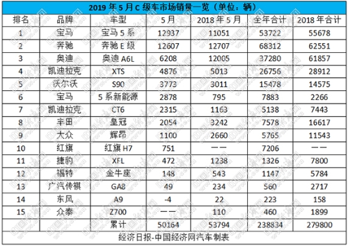 5月,國(guó)產(chǎn)C級(jí)車整體銷量為50164輛,環(huán)比增長(zhǎng)7.29%,與去年同期相比下降6.75%;前5月累計(jì)銷量為238834輛,同比下滑14.64%,單月和累計(jì)銷量跌幅均有所收窄。不過(guò),這一成績(jī)并未來(lái)自各個(gè)車型的均勻發(fā)力。記者統(tǒng)計(jì)的15款車型中,奔馳E級(jí)、寶馬5系和凱迪拉克XTS等強(qiáng)勢(shì)地“跑贏了大盤”,而尾部的車型已被狠狠“甩在身后”,有的銷量甚至出現(xiàn)負(fù)數(shù)。