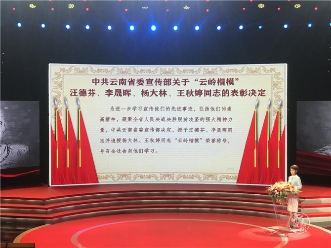 6月19日,省委宣傳部在云南廣播電視臺(tái)“云嶺楷模”發(fā)布廳發(fā)布2019年第一批“云嶺楷?!毕冗M(jìn)事跡,授予汪德芬、李晟暉同志,追授楊大林、王秋婷同志“云嶺楷模”榮譽(yù)稱號(hào),號(hào)召全社會(huì)向他們學(xué)習(xí),決戰(zhàn)脫貧攻堅(jiān)。