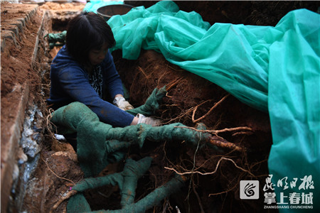 記者現(xiàn)場(chǎng)看到,目前負(fù)責(zé)復(fù)壯工作的專(zhuān)業(yè)人員正在緊張施工,因古樹(shù)生長(zhǎng)位置地下根系盤(pán)錯(cuò)交織,為復(fù)壯溝的開(kāi)挖工作帶來(lái)較大困難。工人們必須小心、謹(jǐn)慎,用近乎“考古”的嚴(yán)苛方式和態(tài)度,來(lái)完成此項(xiàng)工作。對(duì)于開(kāi)挖復(fù)壯溝暴露出來(lái)的部分根系,工人們也用特殊材料濕潤(rùn)后包裹覆蓋,防止烈日侵蝕到根系。