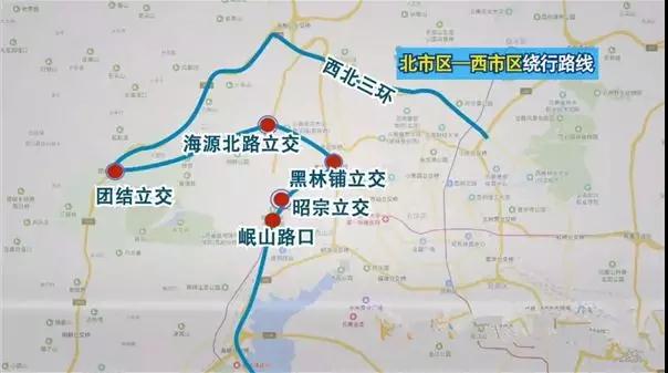二、從北市區(qū)前往西市區(qū)的車輛,走西北三環(huán)主道到團(tuán)結(jié)立交、海源北路立交、黑林鋪立交、昭宗立交、眠山路口再轉(zhuǎn)入其他道路進(jìn)入西市區(qū)。