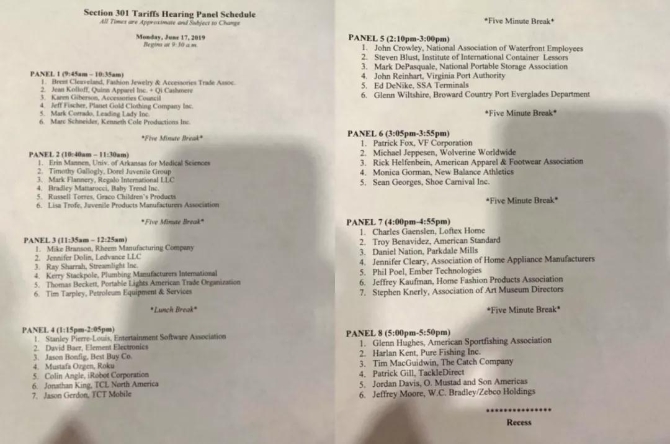 美國時間6月17日,早上9點30分,聽證會正式開始。從現場拿到的日程安排來看,第一天共有49家企業(yè)代表出席聽會,他們被分成八組,每組6到7人,包括零售、制造、高科技企業(yè)等。召開聽證的一方為來自美國貿易代表辦公室、美國商務部、美國國務院等機構的代表——前者向后者提交了口頭或書面陳詞。