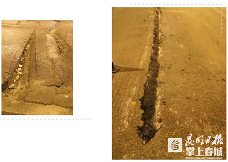調(diào)頭進(jìn)入隧道南側(cè)道路(普吉往龍泉路方向),行進(jìn)約1公里左右時(shí),前方車(chē)輛不斷踩亮剎車(chē),車(chē)速放緩。記者隨之放慢速度觀察發(fā)現(xiàn),從南側(cè)道路下坡進(jìn)彎處起,坑洼、裂縫、鼓包等分布在長(zhǎng)約1公里的路面上,直至快出隧道,路面才平整一些。