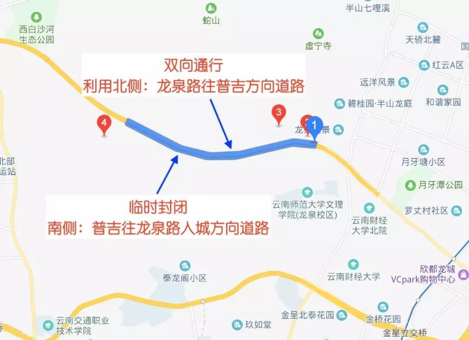 施工期間,將臨時(shí)封閉崗頭山隧道南側(cè)(普吉往龍泉路入城方向)道路,車(chē)輛利用崗頭山隧道北側(cè)(龍泉路往普吉方向出城方向)道路雙向通行。
