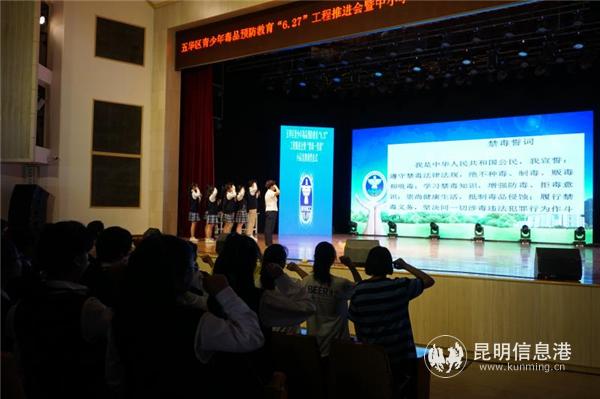 楊勇作了五華區(qū)青少年毒品預(yù)防教育“6.27”工程工作報(bào)告。龍泉路小學(xué)等學(xué)校現(xiàn)場展演“禁毒一堂課”,在一職中師生帶領(lǐng)下,全體參會(huì)人員莊嚴(yán)宣誓“禁絕毒品,從我做起”。