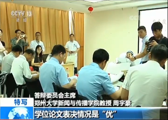 答辯委員會主席 鄭州大學新聞與傳播學院教授 周宇豪:經(jīng)答辯委員會全體委員投票表決,程艷芳同學的論文已經(jīng)達到畢業(yè)要求,已經(jīng)達到碩士學位要求,建議校學位委員會授予碩士學位,學位論文表決情況是“優(yōu)”。
