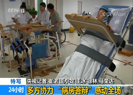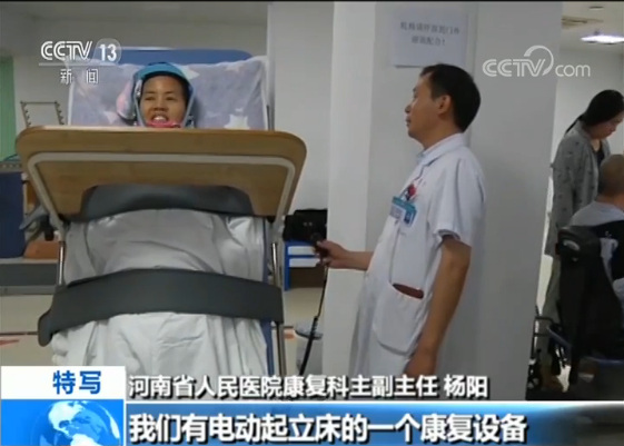 河南省人民醫(yī)院康復科主副主任 楊陽:以前我們都是讓她斜躺30分鐘就可以了,但是答辯的時候你想一般人要稍微坐一下的感覺,她答辯的時候要接近40度、50度,我們有電動起立床的一個康復設備,然后讓她在這個設備上不斷的適應。