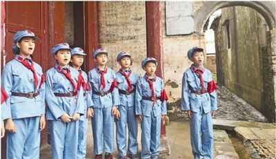廣東南雄市油山鎮(zhèn)大塘中心小學(xué)學(xué)生在徐氏宗祠前齊唱《當(dāng)紅軍歌》。記者林小溪/攝