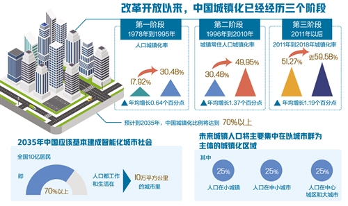改革開(kāi)放以來(lái),中國(guó)城鎮(zhèn)化已經(jīng)經(jīng)歷三個(gè)階段:第一階段是1978年到1995年快速增長(zhǎng)的城鎮(zhèn)化前期:人口城鎮(zhèn)化率從17.92%上升到30.48%,年均增長(zhǎng)0.64個(gè)百分點(diǎn);第二階段是1996年到2010年城鎮(zhèn)化加速增長(zhǎng)的中前期:城鎮(zhèn)常住人口城鎮(zhèn)化率從30.48%上升至49.95%,年均增長(zhǎng)1.37個(gè)百分點(diǎn);第三階段是2011年以后,城鎮(zhèn)化快速增長(zhǎng)的中后期:2011年到2018年,城鎮(zhèn)化率從51.27%上升至近59.58%,年均增長(zhǎng)1.19個(gè)百分點(diǎn)。與此同時(shí),中國(guó)城市土地開(kāi)發(fā)和基礎(chǔ)設(shè)施建設(shè)不斷提速。