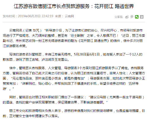 “聽導(dǎo)游介紹,為了讓游客們游的放心、盡興和開心,市領(lǐng)導(dǎo)對旅游市場進行了嚴格規(guī)范、大刀闊斧的整頓,甚至有‘壯士斷腕’之舉,令人敬佩不已!“近日,麗江市委副書記、市長鄭藝收到一封江蘇無錫游客寄來的題為《花開麗江 路通世界》的信件,信中多次對麗江旅游服務(wù)點贊。(6月20日 云南網(wǎng))