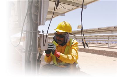 埃及南部城市阿斯旺光伏電站項(xiàng)目的工人正在檢修設(shè)備,該項(xiàng)目由中企承建。記者周輖/攝