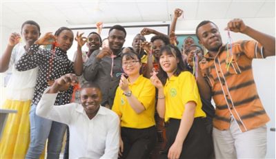 達(dá)累斯薩拉姆大學(xué)孔子學(xué)院的中國文化課堂上,孔院師生與自己制作的中國結(jié)合影。記者呂強(qiáng)/攝