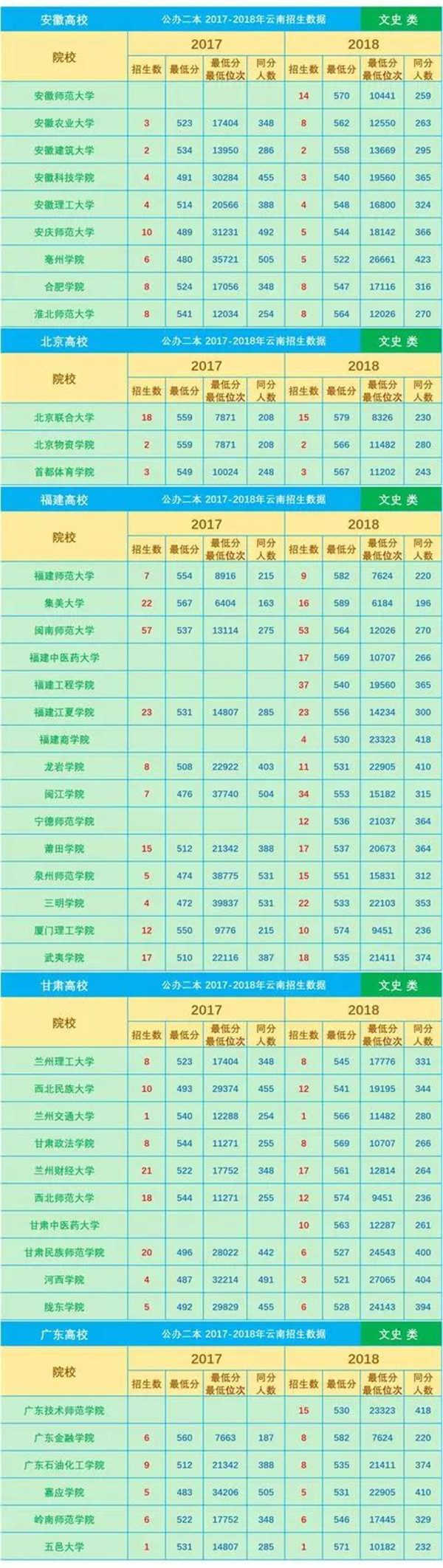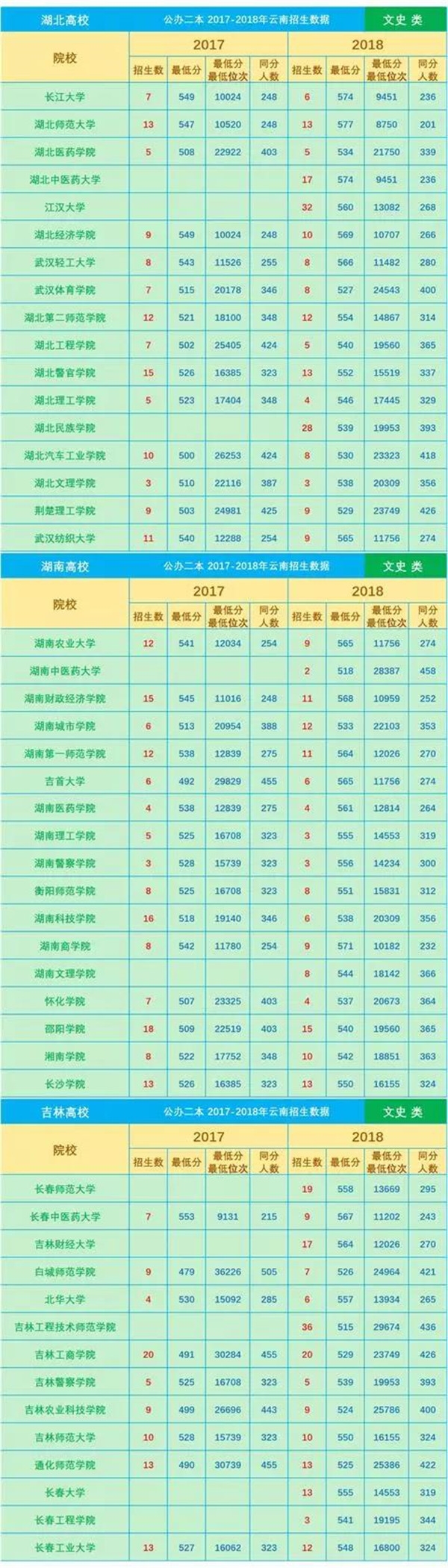 2016-2018年云南省普通高校招生本科二批院校平行志愿錄取最低分(文科)