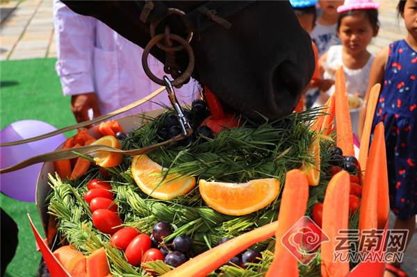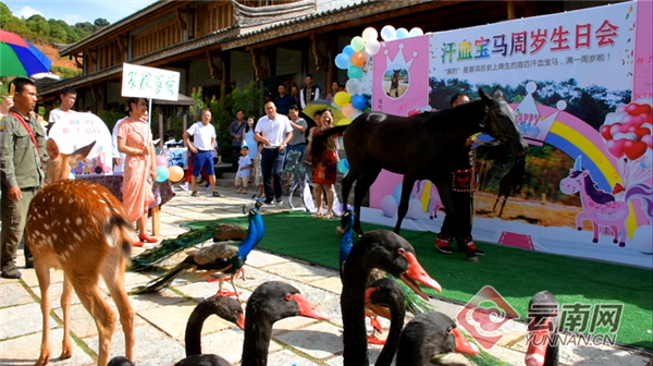 6月23日,普洱茶馬古道旅游景區(qū)為小汗血寶馬“黑豹”舉辦了一周歲生日會。正值周末,一大早,得知景區(qū)要給小動物辦生日會,一些家長早早帶著小朋友們守候在現(xiàn)場,在生日會背景墻上寫下對“黑豹”的生日祝?!,F(xiàn)場,“黑豹”的身邊聚焦了好多小伙伴,梅花鹿、黑天鵝、孔雀等小動物在景區(qū)安排下“相約”前來“道賀”。