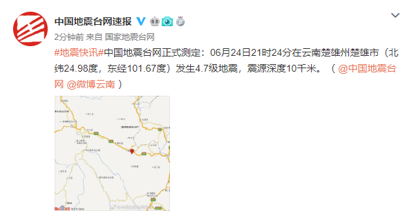 昆明信息港訊 據(jù)中國地震臺(tái)網(wǎng)速報(bào),06月24日21時(shí)24分在云南楚雄州楚雄市(北緯24.98度,東經(jīng)101.67度)發(fā)生4.7級(jí)地震,震源深度10千米。