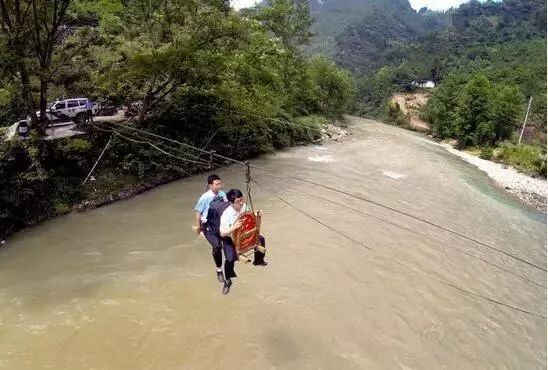 2015年6月9日,重慶奉節(jié)縣大山里的興隆鎮(zhèn)回龍村,奉節(jié)縣法院第三法庭法官乘溜索進(jìn)村普法。在河面上空,兩名背著“巡回法庭”背包、捧著國(guó)徽的小伙,像一個(gè)“吊斗”,一把把用手扯著鋼絲上的繩索,搖搖晃晃向河對(duì)岸50米外的村莊滑去……