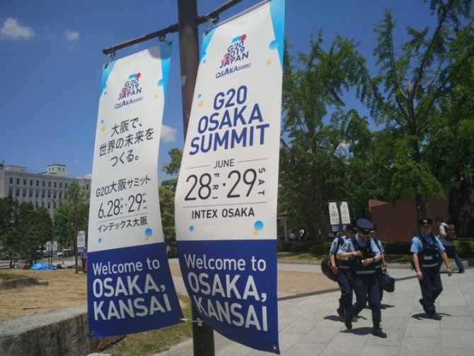 入夏的大阪,驕陽(yáng)燦爛,綠意蔥籠,海風(fēng)輕拂路人。隨著峰會(huì)臨近,在大阪主要景區(qū)、酒店、商廈及干道,均可以看到帶有二十國(guó)集團(tuán)領(lǐng)導(dǎo)人大阪峰會(huì)元素的標(biāo)牌、海報(bào)和條幅。