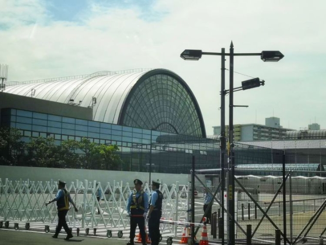 在著名景點(diǎn)大阪城附近,幾名警察從標(biāo)有“在大阪創(chuàng)造世界未來(lái)”字樣的條幅旁走過(guò)。新華社記者龐興雷攝