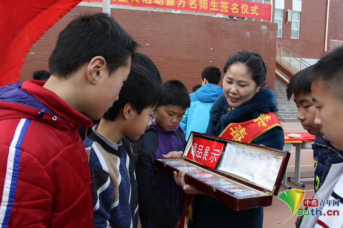 2017年陳紅在宿州市十一中向同學(xué)們展示毒品知識(shí)。本人供圖