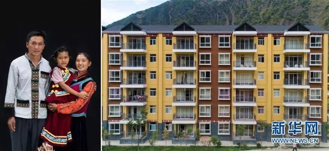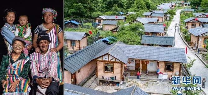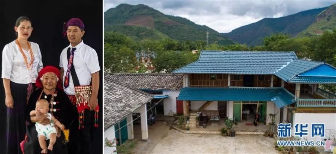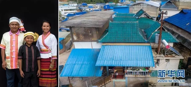 左圖:怒江傈僳族自治州瀘水市大興地鎮(zhèn)維拉壩“珠海社區(qū)”傈僳族村民楊玉興(左)一家合影(6月24日新華社記者秦晴/攝);右圖:大興地鎮(zhèn)維拉壩“珠海社區(qū)”一角。楊玉興一家2018年12月從大興地鎮(zhèn)維拉羅三組搬入該社區(qū)。他家種植核桃樹4000株,草果20畝,全家年收入約4萬元(6月24日新華社記者胡超/攝)。