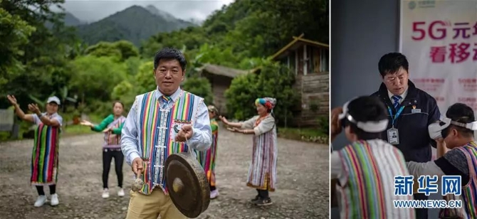 左圖:在貢山縣獨(dú)龍江鄉(xiāng)移動(dòng)營業(yè)廳上班的馬春海(獨(dú)龍族)。在他身后,獨(dú)龍族群眾在跳本民族舞蹈(6月21日攝);右圖:馬春海在指導(dǎo)當(dāng)?shù)厝罕婓w驗(yàn)5G虛擬現(xiàn)實(shí)。獨(dú)龍江鄉(xiāng)今年開通了5G試驗(yàn)基站(6月21日攝)。 新華社記者 江文耀/攝