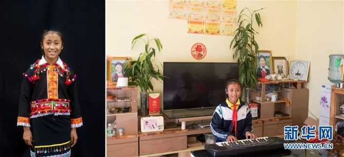 左圖:李成香,德昂族,今年12歲,家住芒市三臺(tái)山德昂族鄉(xiāng)出冬瓜村,三臺(tái)山德昂族鄉(xiāng)九年制學(xué)校五年級(jí)學(xué)生(6月19日新華社記者秦晴/攝);右圖:李成香在家里彈電子琴(6月19日新華社記者胡超/攝)。她的夢(mèng)想是成為鋼琴家。