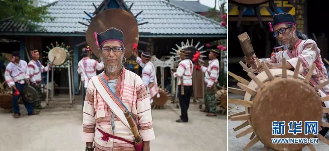 左圖:在景洪市基諾山基諾族鄉(xiāng)巴坡村拍攝的基諾大鼓舞省級(jí)非遺傳承人白臘先(基諾族)。在他身后,他的徒弟們?cè)谡故净Z族大鼓舞(6月14日新華社記者胡超/攝);右圖:白臘先在自家庭院制作基諾大鼓(6月14日新華社記者秦晴/攝)。