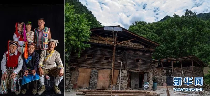 左圖:怒江傈僳族自治州貢山縣獨(dú)龍江鄉(xiāng)迪政當(dāng)村獨(dú)龍族的“文面女”李文仕(前排左)一家合影(6月21日攝);右圖:李文仕和其他村民的房子(6月21日攝),這些房子是當(dāng)?shù)卣?011年統(tǒng)一修建的。新華社記者 江文耀/攝