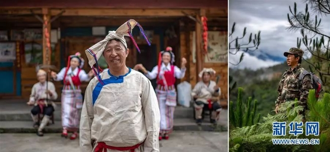 左圖:貢山縣丙中洛鎮(zhèn)雙拉村村民陳麗軍(怒族)。在他身后,雙拉村文藝隊(duì)隊(duì)員在展示怒族的吹拉彈唱(6月22日攝);右圖:陳麗軍在巡護(hù)森林途中(6月23日攝)。 新華社記者 江文耀/攝