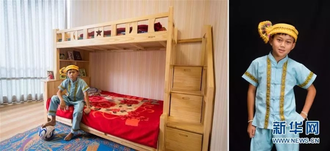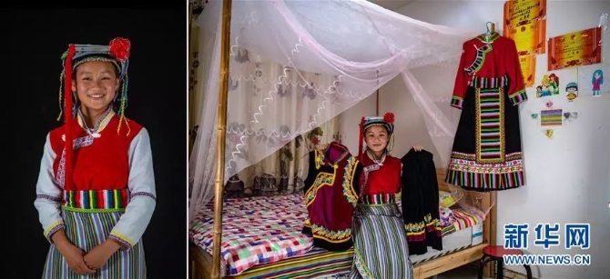 左圖:豐元吉,怒族,今年12歲,家住貢山縣丙中洛鎮(zhèn)甲申村(6月22日攝);右圖:豐元吉在臥室里展示自己收集的民族服飾(6月22日攝)。她很喜歡少數(shù)民族服裝,常常會(huì)穿其他民族的服裝去表演。 新華社記者江文耀/攝