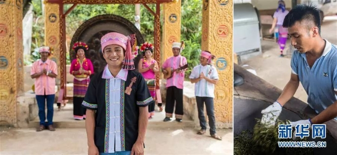 左圖:勐??h布朗山布朗族鄉(xiāng)老曼峨村村民巖煙叫(布朗族)。在他身后,村民在展示布朗彈唱(6月13日新華社記者胡超/攝);右圖:巖煙叫在炒制剛剛采下的茶葉。他畢業(yè)于云南林業(yè)職業(yè)技術(shù)學(xué)院園林工程專業(yè),回鄉(xiāng)創(chuàng)業(yè)做茶葉初制加工,家里種植茶葉約80畝,2018年收入約20萬元(6月13日新華社記者秦晴/攝)。
