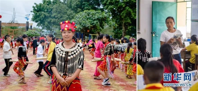 左圖:芒市西山鄉(xiāng)營盤民族小學(xué)老師雷木寬(景頗族)。在她身后,學(xué)生們?cè)陂_展民族舞“目瑙縱歌”課間操(6月21日新華社記者胡超/攝);右圖:雷木寬在課堂上(6月21日新華社記者秦晴/攝)。
