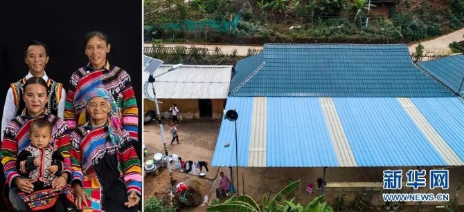 左圖:普洱市西盟佤族自治縣勐梭鎮(zhèn)班母村拉祜族村民扎莫(后排左)一家合影(6月16日新華社記者胡超/攝);右圖:扎莫家2015年建成的房子。當(dāng)?shù)亟涤炅看螅芏嗉彝?huì)在房前搭建棚子,用于晾曬農(nóng)作物。扎莫一家種植茶葉5畝,青貯玉米6畝,砂仁10畝,同時(shí)擔(dān)任小組長(zhǎng)、護(hù)林員等,去年全年收入近4萬元(6月16日新華社記者秦晴/攝)。